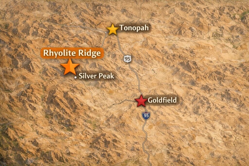 The Rhyolite Ridge Lithium Project is located in Esmeralda County, Nevada, near the community of Silver Peak in west-central Nevada. The project area lies south of Tonopah and west of U.S. Highway 95, within a region that has a long history of mineral exploration and mining activity. The area is part of Nevada’s broader lithium resource region, which includes several lithium deposits and development projects across the state.